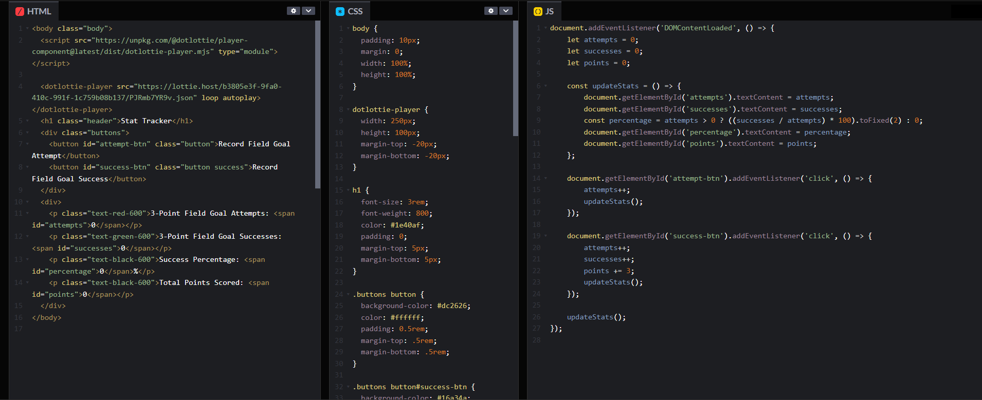 Handed to me by a manager as a new hire coding challenge, this project was my shot at creating a stat tracker for field goals. It keeps tabs on the number of attempts, successful shots, and the success percentage, all in real time! This was one of my first adventures in combining HTML, CSS, and JavaScript to bring a functional idea to life.